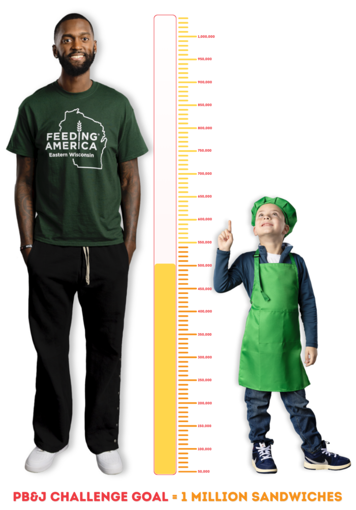 We’ve teamed up with NBA Champion, Bobby Portis Jr. to encourage others to give in whatever way they can during the PB&J Challenge. For a limited time only, thanks to a generous match from an anonymous donor, every monetary donation will be DOUBLED. That’s right, every $5 donated will provide the equivalent of 70 peanut butter and jelly sandwiches for local kids facing hunger! Help us meet our goal of 1 MILLION PB&J sandwiches this year!